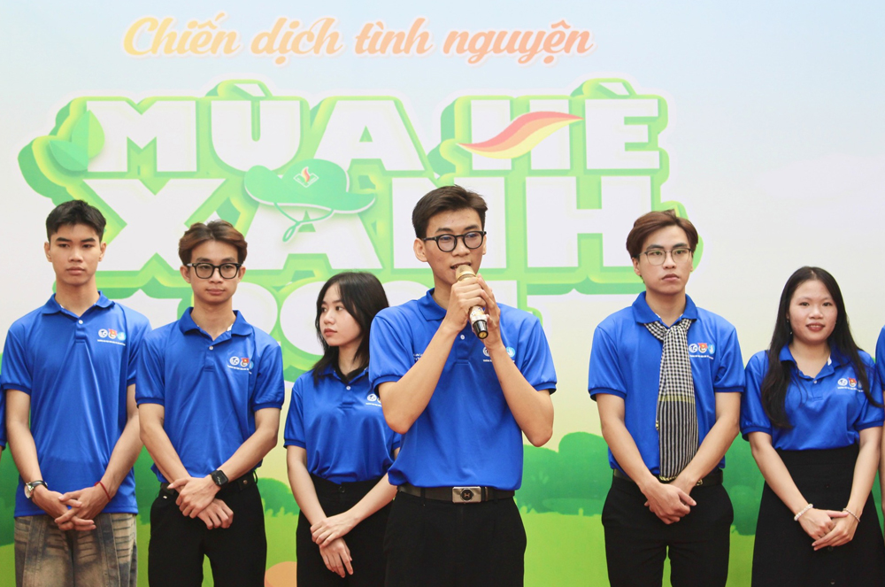 Đ/c Lương Tấn Tài, Bí thư Đoàn Trường - Chỉ huy Trưởng Chiến dịch Mùa hè xanh năm 2024 phát biểu tại Lễ xuất quân. Ảnh: BTTCD.
