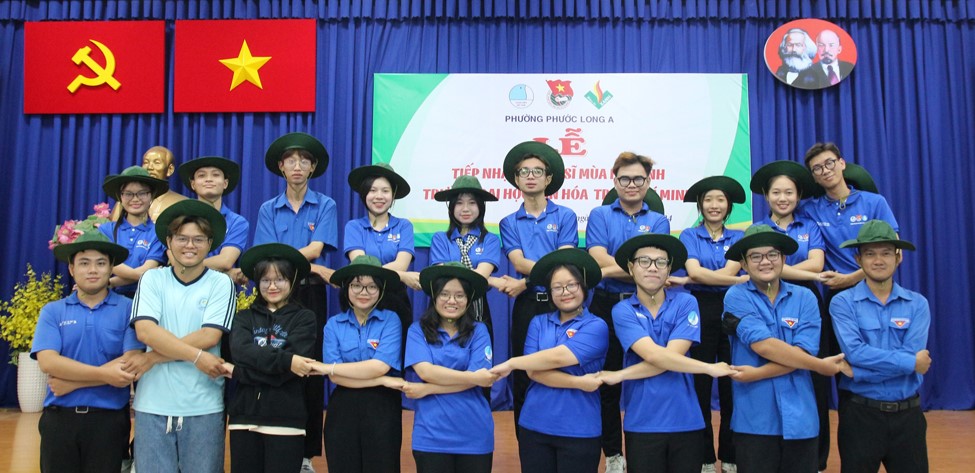 Đội hình sinh viên tinh nguyện Chiến dịch Mùa hè xanh năm 2024 tại mặt trận Phường Phước Long A tại buổi tiếp nhận quân sáng 6/7. Ảnh: BTTCD.