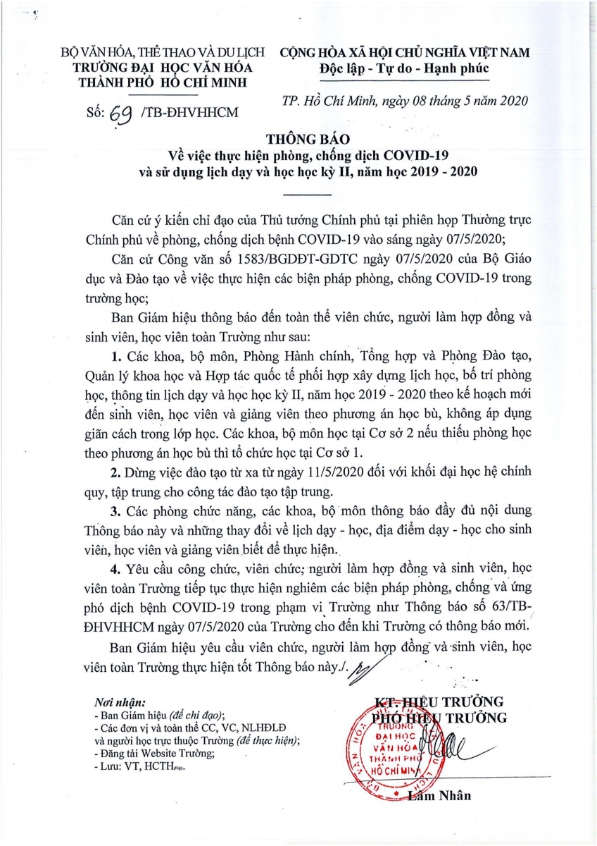 08 May Thông báo số 69/TB-ĐHVHHCM ngày 08/5/2020 của Trường về việc thực hiện phòng, chống dịch COVID-19 và sử dụng lịch dạy và học học kỳ II, năm học 2019 - 2020. Nguyễn Hải Gian 2759 Xem Share: