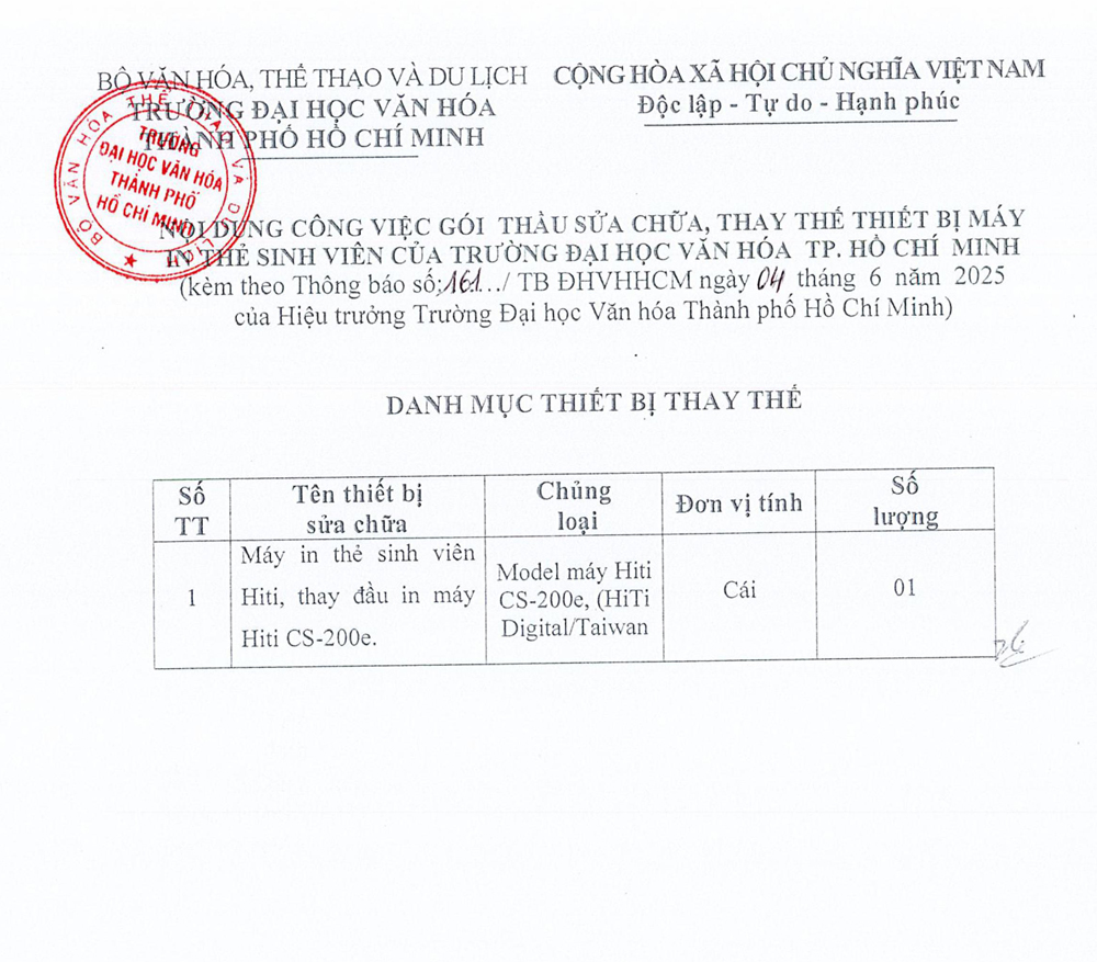 13.04.2026 Thông báo về việc mời các đơn vị quan tâm nộp hồ sơ đăng ký thực hiện gói thầu in ấn phôi bằng, chứng chỉ phục vụ cho công tác đào tạo và cấp phát văn bằng của Trường Đại học Văn hóa Thành phố Hồ Chí Minh