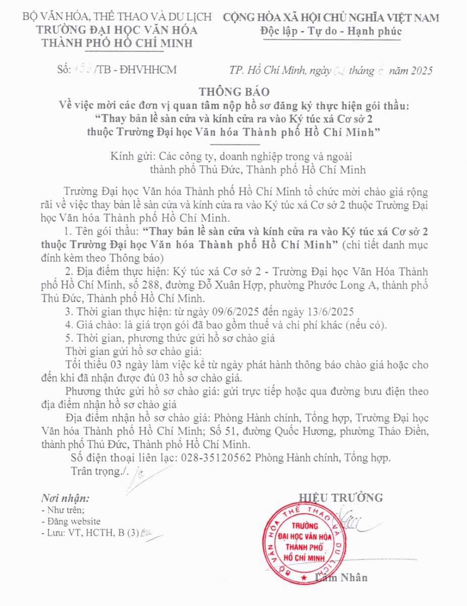 25.03.2026 Thông báo về việc mời các đơn vị quan tâm nộp hồ sơ đăng ký thực hiện gói thầu trang bị tủ gỗ đựng hồ sơ, bàn làm việc,... cho Trường Đại học Văn hóa Thành phố Hồ Chí Minh