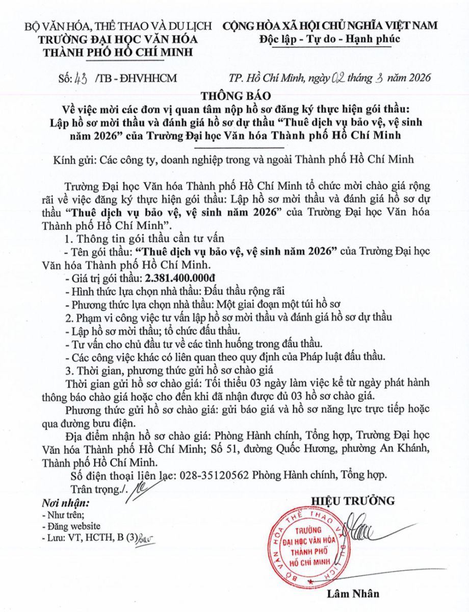 26.03.2026 Thông báo về việc mời các đơn vị quan tâm nộp hồ sơ đăng ký thực hiện gói thầu thực hiện dịch vụ bảo trì phần mềm quản trị Trường Đại học Văn hóa Thành phố Hồ Chí Minh