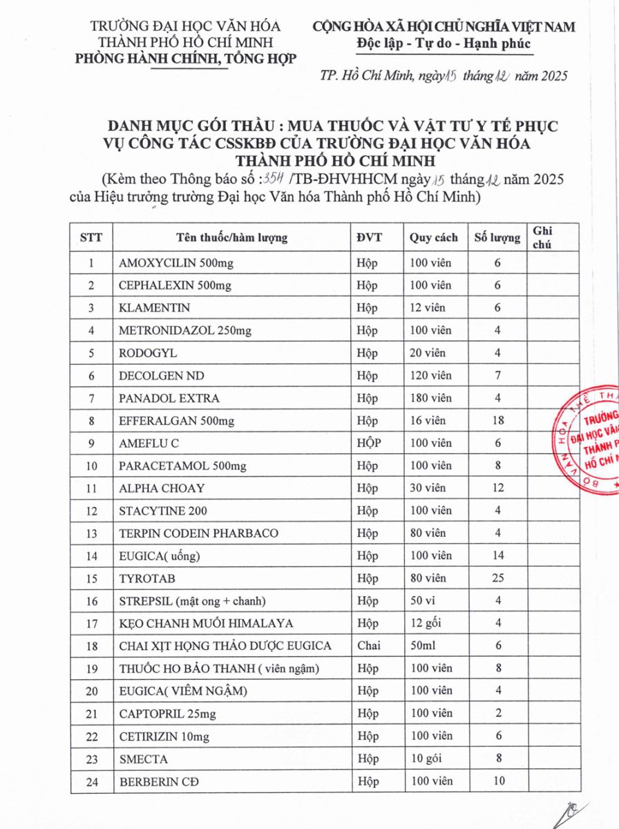 25.03.2026 Thông báo về việc mời các đơn vị quan tâm nộp hồ sơ đăng ký thực hiện gói thầu trang bị tủ gỗ đựng hồ sơ, bàn làm việc,... cho Trường Đại học Văn hóa Thành phố Hồ Chí Minh