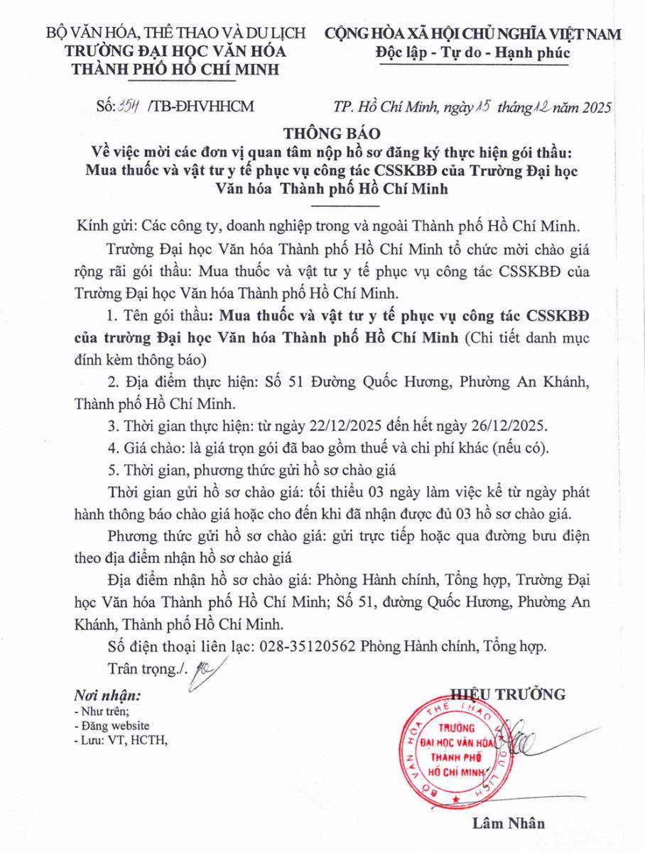 26.03.2026 Thông báo về việc mời các đơn vị quan tâm nộp hồ sơ đăng ký thực hiện gói thầu thực hiện dịch vụ bảo trì phần mềm quản trị Trường Đại học Văn hóa Thành phố Hồ Chí Minh