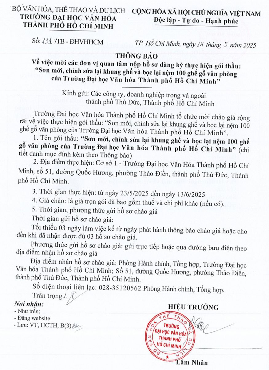 25.03.2026 Thông báo về việc mời các đơn vị quan tâm nộp hồ sơ đăng ký thực hiện gói thầu trang bị tủ gỗ đựng hồ sơ, bàn làm việc,... cho Trường Đại học Văn hóa Thành phố Hồ Chí Minh