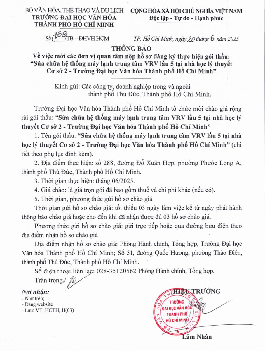 26.03.2026 Thông báo về việc mời các đơn vị quan tâm nộp hồ sơ đăng ký thực hiện gói thầu thực hiện dịch vụ bảo trì phần mềm quản trị Trường Đại học Văn hóa Thành phố Hồ Chí Minh