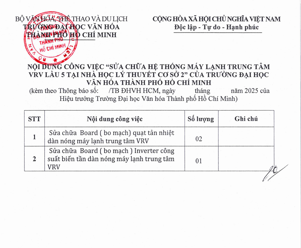 15.04.2026 Thông báo về việc mời các đơn vị quan tâm nộp hồ sơ đăng ký thực hiện gói thầu cung cấp thiết bị để thay thế, sửa chữa hệ thống bể xử lý nước thải tại cs2 của Trường Đại học Văn hóa Thành phố Hồ Chí Minh