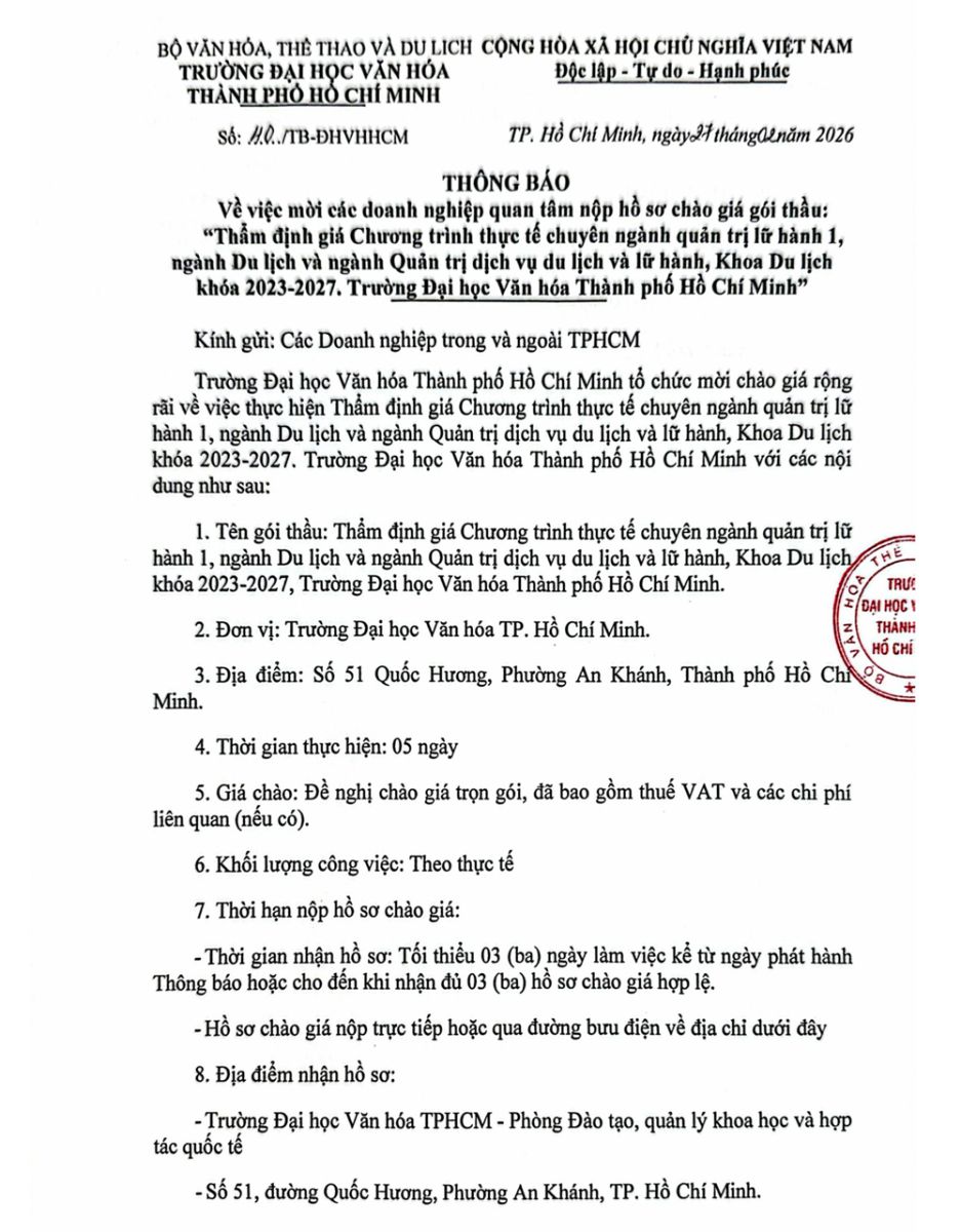 13.04.2026 Thông báo về việc mời các đơn vị quan tâm nộp hồ sơ đăng ký thực hiện gói thầu in ấn phôi bằng, chứng chỉ phục vụ cho công tác đào tạo và cấp phát văn bằng của Trường Đại học Văn hóa Thành phố Hồ Chí Minh