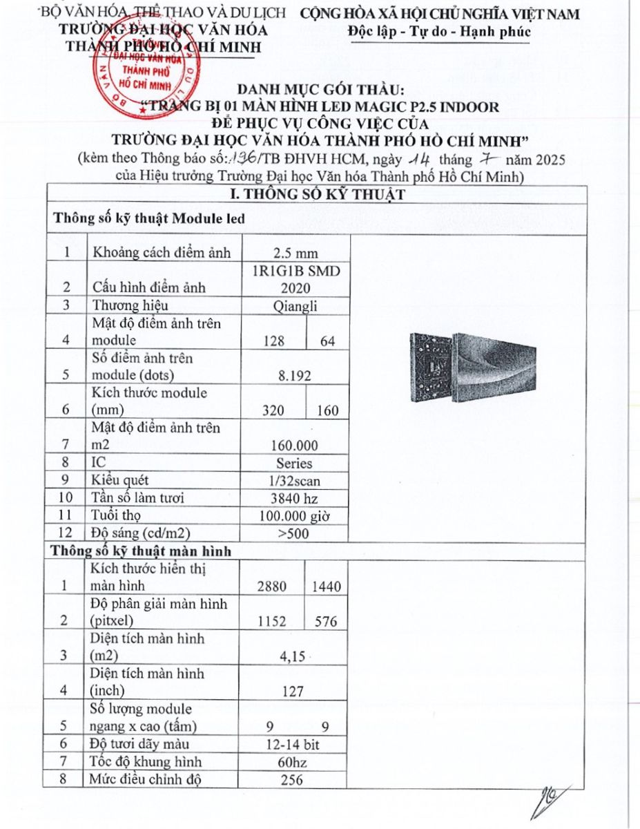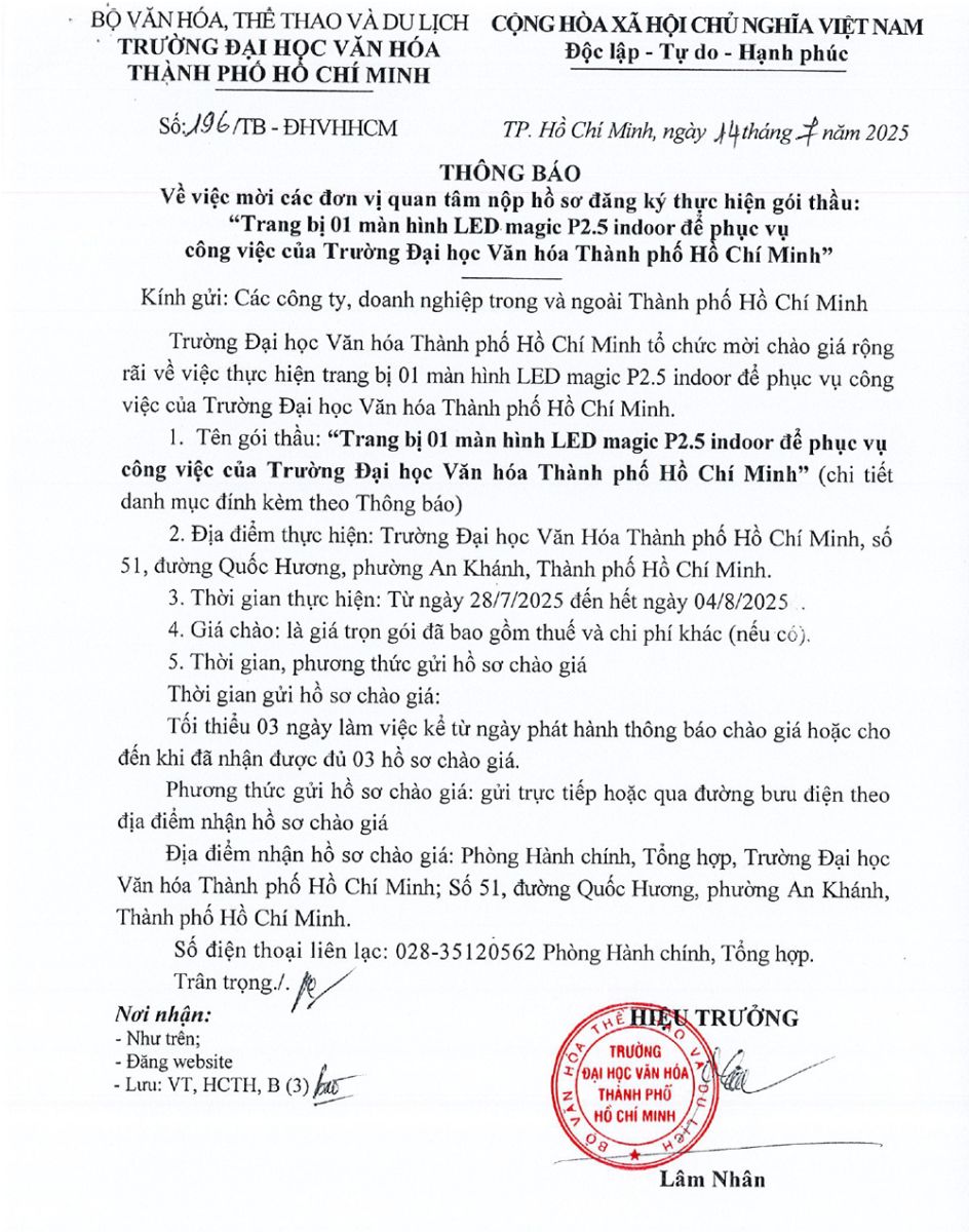 25.03.2026 Thông báo về việc mời các đơn vị quan tâm nộp hồ sơ đăng ký thực hiện gói thầu trang bị tủ gỗ đựng hồ sơ, bàn làm việc,... cho Trường Đại học Văn hóa Thành phố Hồ Chí Minh