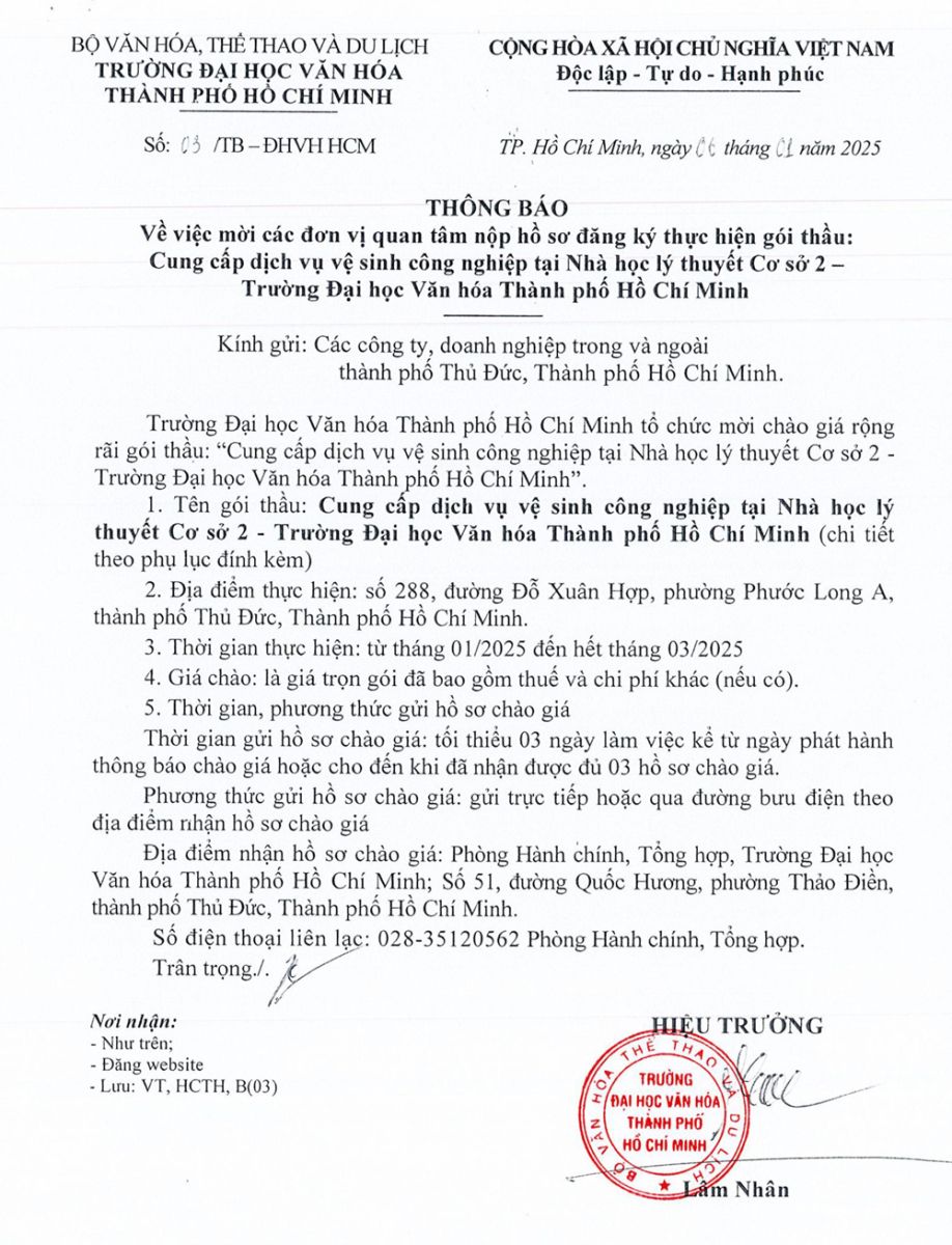26.03.2026 Thông báo về việc mời các đơn vị quan tâm nộp hồ sơ đăng ký thực hiện gói thầu thực hiện dịch vụ bảo trì phần mềm quản trị Trường Đại học Văn hóa Thành phố Hồ Chí Minh