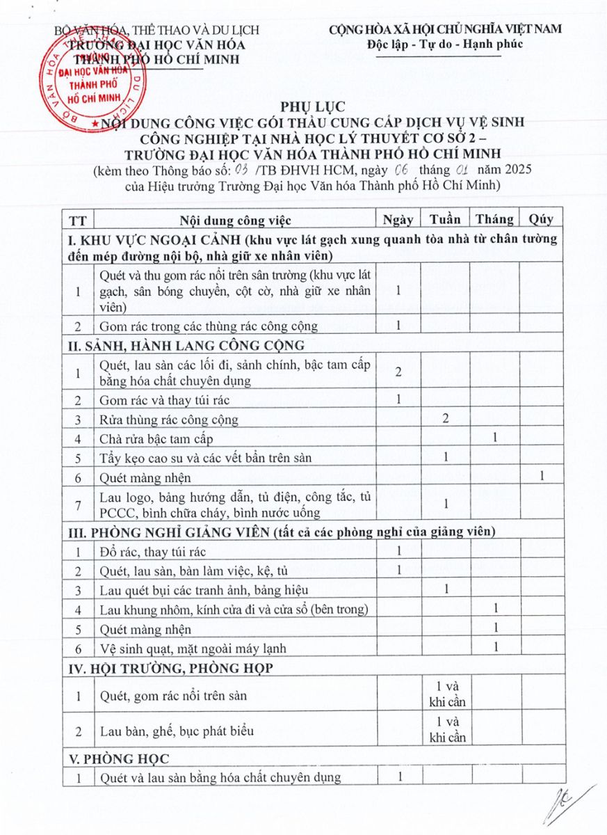 15.04.2026 Thông báo về việc mời các đơn vị quan tâm nộp hồ sơ đăng ký thực hiện gói thầu cung cấp thiết bị để thay thế, sửa chữa hệ thống bể xử lý nước thải tại cs2 của Trường Đại học Văn hóa Thành phố Hồ Chí Minh