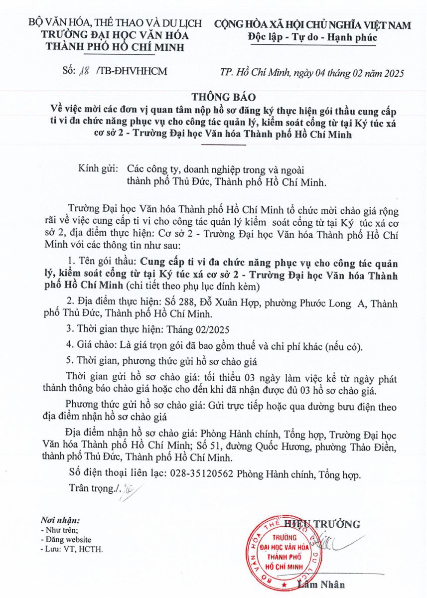 26.03.2026 Thông báo về việc mời các đơn vị quan tâm nộp hồ sơ đăng ký thực hiện gói thầu thực hiện dịch vụ bảo trì phần mềm quản trị Trường Đại học Văn hóa Thành phố Hồ Chí Minh