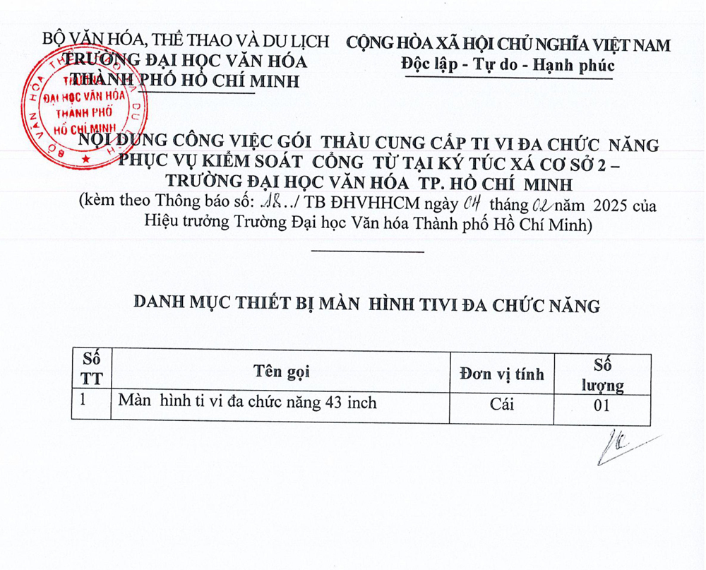 25.03.2026 Thông báo về việc mời các đơn vị quan tâm nộp hồ sơ đăng ký thực hiện gói thầu trang bị tủ gỗ đựng hồ sơ, bàn làm việc,... cho Trường Đại học Văn hóa Thành phố Hồ Chí Minh