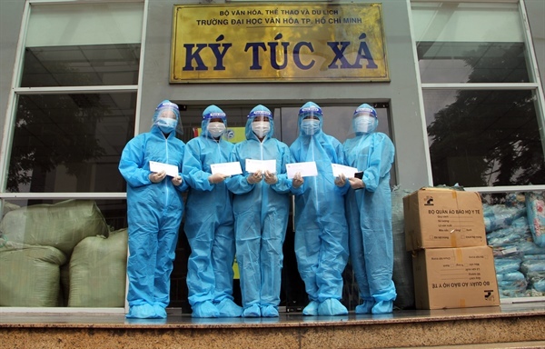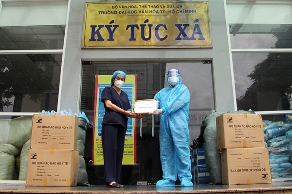 VHO - Chiều 15.8, tại Khu cách ly tập trung Ký túc xá Trường ĐH Văn hóa TP.HCM, nghệ nhân dân gian Phạm Thị Đoan Trang, hội viên Hội Di sản Văn hóa Việt Nam, hội viên Câu lạc bộ Bảo tồn Văn hóa Đạo Mẫu Việt Nam thuộc Trung tâm Nghiên cứu và Bảo tồn Văn hóa Tín ngưỡng Việt Nam đã trao tặng vật dụng y tế đến đội ngũ tham gia công tác phòng, chống dịch Covid-19 tại khu cách ly.