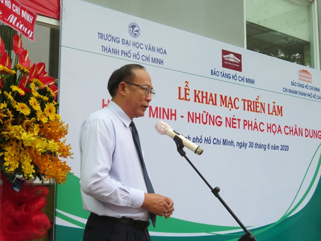 PSG.TS Nguyễn Thế Dũng - Bí thư Đảng ủy, Hiệu trưởng Trường Đại học Văn hóa TP. Hồ Chí Minh phát biểu chúc mừng triển lãm.