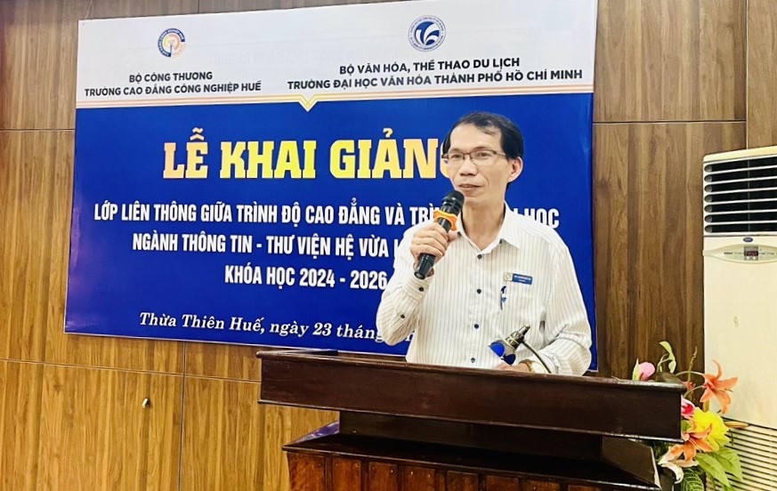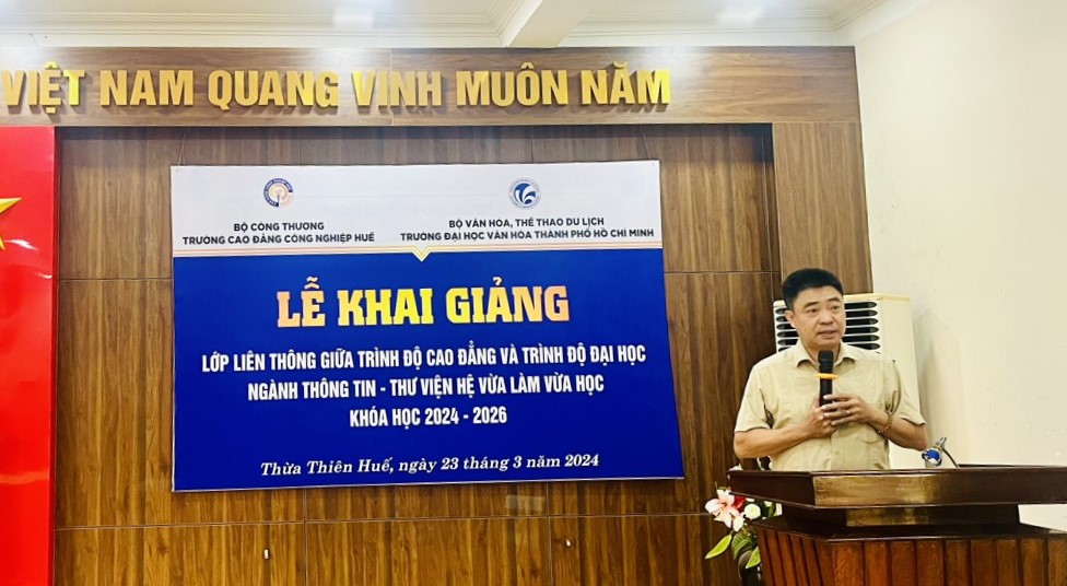 Phát biểu tại Lễ khai giảng, PGS.TS. Lâm Nhân, Hiệu trưởng Trường Đại học Văn hóa Thành phố Hồ Chí Minh cho biết: Để phục vụ nhu cầu của người học trên hành trình lĩnh hội tri thức và đáp ứng chuẩn chức danh nghề nghiệp, đồng thời thực hiện đúng chức năng, nhiệm vụ giáo dục và đào tạo của mình, Trường Đại học Văn hóa Thành phố Hồ Chí Minh phối hợp cùng với Trường Cao đẳng Công nghiệp Huế tổ chức tuyển sinh liên thông giữa trình độ cao đẳng với trình độ đại học ngành Thông tin - Thư viện khóa học 2024 - 2026. Trường Đại học Văn hóa Thành phố Hồ Chí Minh, trải qua quá trình hình thành và phát triển gần 50 năm, song song với đào tạo hệ chính quy, công tác đào tạo vừa làm vừa học cũng được Nhà trường đặc biệt quan tâm. Chất lượng đào tạo của Trường đối với hình thức đào tạo hệ vừa làm vừa học ngày càng được khẳng định. Bên cạnh những nỗ lực, tận tình hướng dẫn của thầy, cô giáo là quá trình phấn đấu không ngừng trong học tập và rèn luyện của học viên, sự quan tâm, hỗ trợ của gia đình và sự phối hợp chặt chẽ của đơn vị liên kết đào tạo. Trong thời gian tới, Nhà trường sẽ cố gắng nâng cao hơn nữa chất lượng đào tạo nhằm phục vụ tốt hơn nhu cầu học tập nâng cao trình độ của người lao động, đóng góp ngày càng nhiều cho sự phát triển của địa phương.