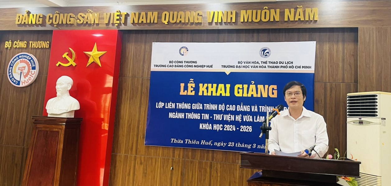 VHSO - Sáng ngày 23/3, tại Trường Cao đẳng Công nghiệp Huế (Số 70 Nguyễn Huệ, phường Vĩnh Ninh, Thành phố Huế). Trường Đại học Văn hóa Thành phố Hồ Chí Minh phối hợp cùng với Trường Cao đẳng Công nghiệp Huế tổ chức Lễ khai giảng lớp Liên thông giữa trình độ Cao đẳng với trình độ Đại học ngành Thông tin - Thư viện, hệ Vừa làm vừa học tại Trường Cao đẳng Công nghiệp Huế.