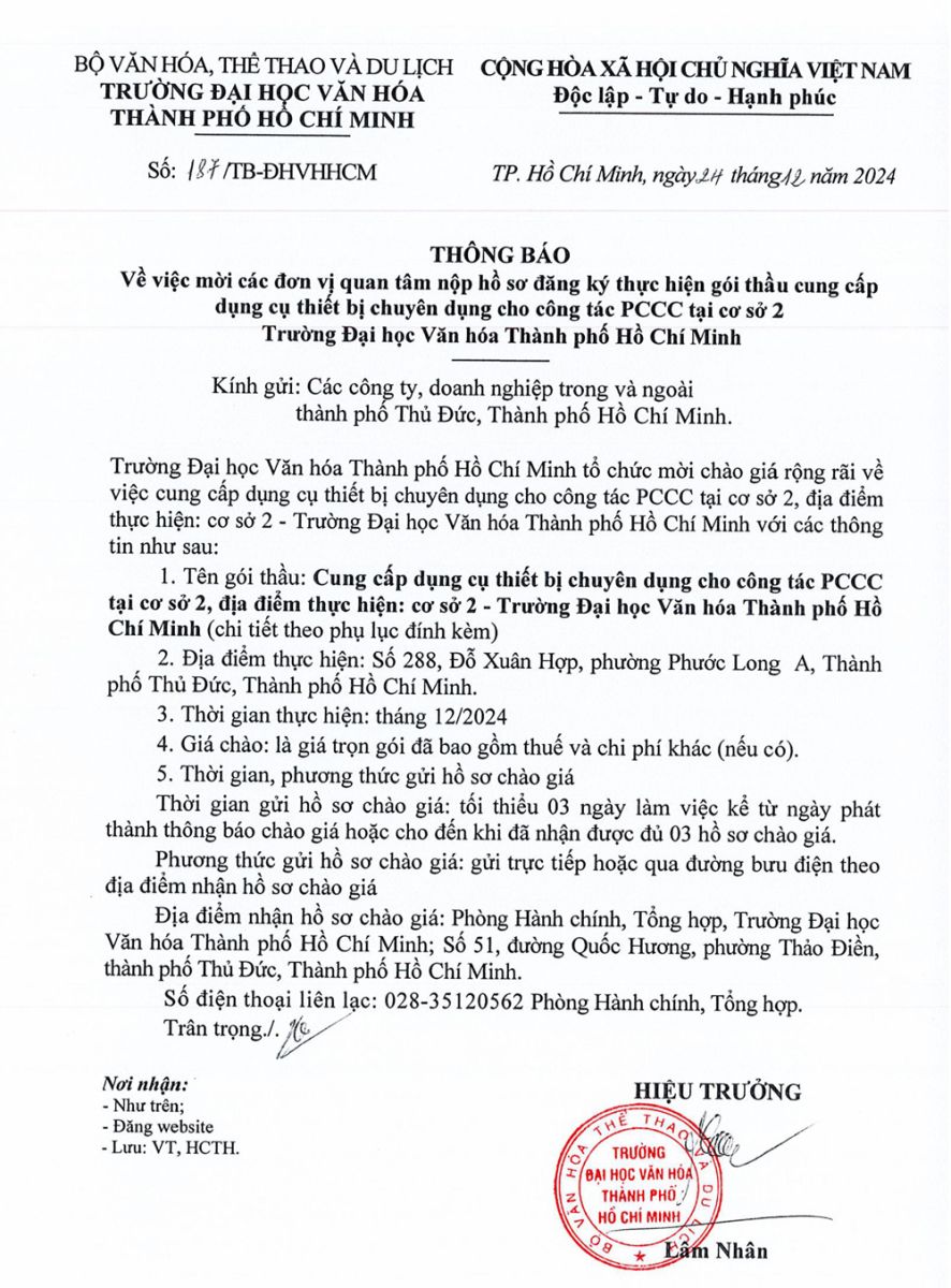 25.03.2026 Thông báo về việc mời các đơn vị quan tâm nộp hồ sơ đăng ký thực hiện gói thầu trang bị tủ gỗ đựng hồ sơ, bàn làm việc,... cho Trường Đại học Văn hóa Thành phố Hồ Chí Minh