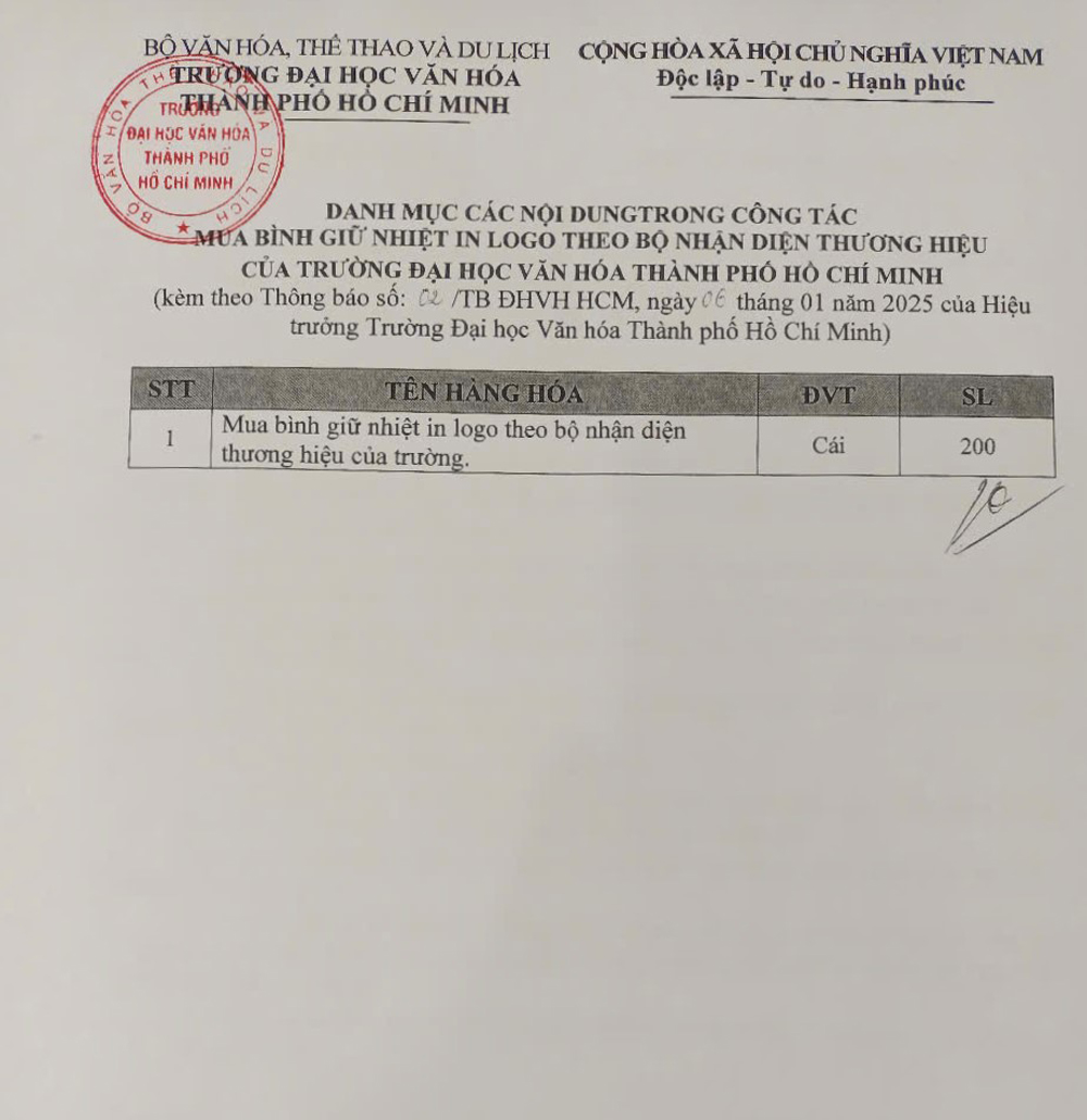 13.04.2026 Thông báo về việc mời các đơn vị quan tâm nộp hồ sơ đăng ký thực hiện gói thầu in ấn phôi bằng, chứng chỉ phục vụ cho công tác đào tạo và cấp phát văn bằng của Trường Đại học Văn hóa Thành phố Hồ Chí Minh