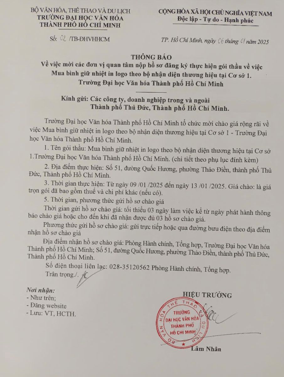 25.03.2026 Thông báo về việc mời các đơn vị quan tâm nộp hồ sơ đăng ký thực hiện gói thầu trang bị tủ gỗ đựng hồ sơ, bàn làm việc,... cho Trường Đại học Văn hóa Thành phố Hồ Chí Minh