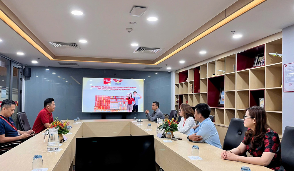 VHSO - Sáng 19/3, Đoàn công tác Trường Đại học Văn hóa TP. Hồ Chí Minh (HCMUC) đã có chuyến tham quan, khảo sát và làm việc tại Học viện Hàng không Victoria (VIAA), đơn vị đào tạo hàng không gắn với hệ sinh thái của Vietjet, nhằm trao đổi định hướng liên kết đào tạo và cung ứng nguồn nhân lực chất lượng cao. Đoàn công tác do PGS.TS Lâm Nhân, Hiệu trưởng HCMUC làm trưởng đoàn, cùng đại diện lãnh đạo Khoa Du lịch và các giảng viên. Tiếp đón đoàn có ông Lê Doãn Quang, Phó Tổng Giám đốc Công ty Cổ phần Hàng không Vietjet; Ông Nguyễn Mạnh Hùng, Giám đốc kinh doanh; Ông Phạm Bảo Thụy, Trưởng Văn phòng Giáo vụ VIAA.