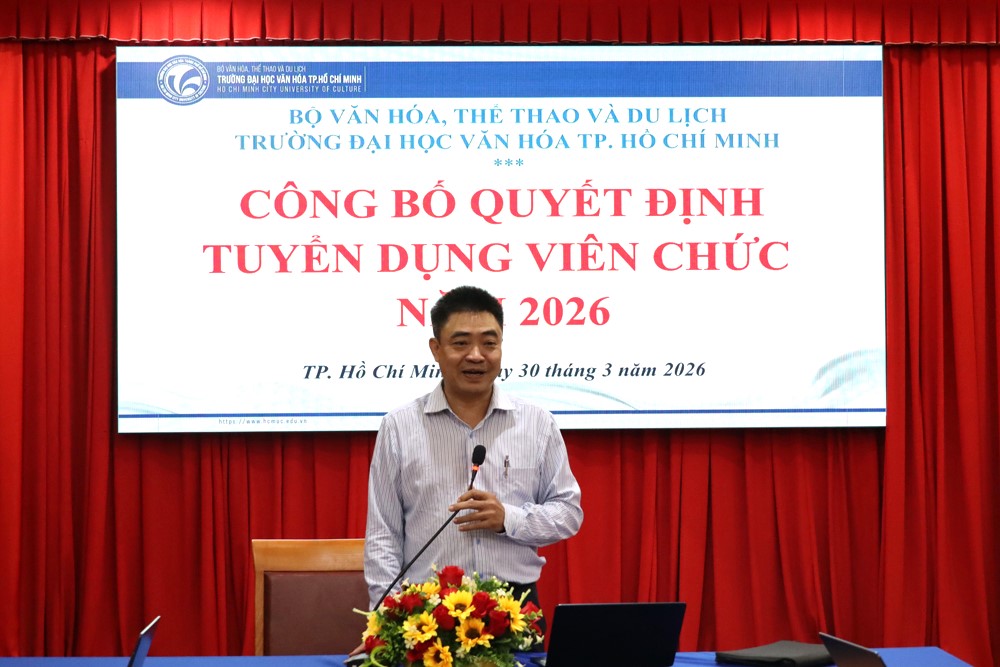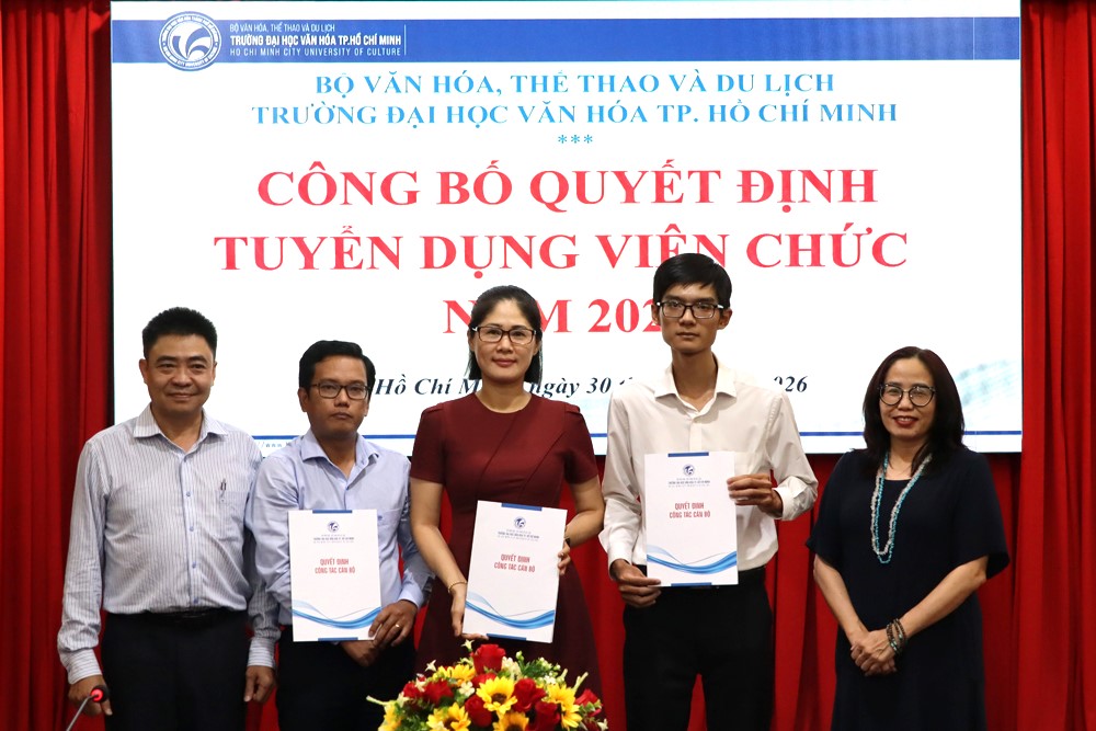 VHSO - Chiều ngày 30/3, Trường Đại học Văn hóa TP. Hồ Chí Minh (HCMUC) đã trang trọng tổ chức lễ công bố và trao quyết định của Hiệu trưởng về việc tuyển dụng viên chức đối với các thí sinh trúng tuyển kỳ tuyển dụng viên chức trong các đơn vị sự nghiệp công lập thuộc Bộ Văn hóa, Thể thao và Du lịch năm 2026. Đây là kỳ tuyển dụng do Bộ Văn hóa, Thể thao và Du lịch tổ chức với quy trình chặt chẽ, nhằm tuyển chọn những ứng viên có trình độ chuyên môn, năng lực và phẩm chất phù hợp, góp phần nâng cao chất lượng nguồn nhân lực cho các đơn vị trực thuộc.