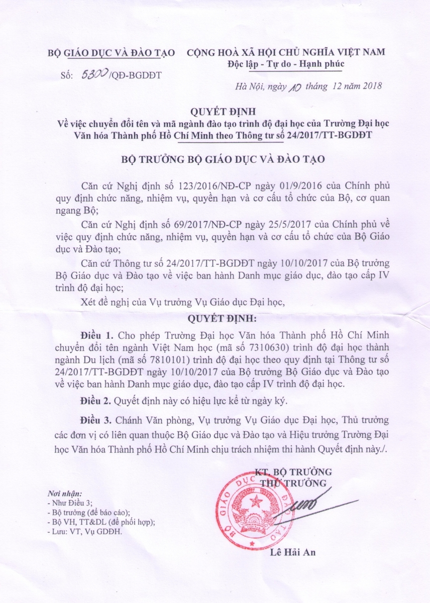Ngày 10 tháng 12 năm 2018, Bộ trưởng Bộ Giáo dục và Đào tạo ký Quyết định số 5300/QĐ-BGDĐT cho phép Trường Đại học Văn hóa Thành phố Hồ Chí Minh chuyển đổi tên ngành Việt Nam học (mã số 7310630) trình độ đại học thành ngành Du lịch (mã số 7810101) trình độ đại học theo quy định tại Thông tư số 24/TT-BGDĐT ngày 10 tháng 10 năm 2017 của Bộ trưởng Bộ Giáo dục và Đào tạo về việc ban hành Danh mục giáo dục, đào tạo cấp IV trình độ đại học. Quyết định có hiệu lực kể từ ngày ký.