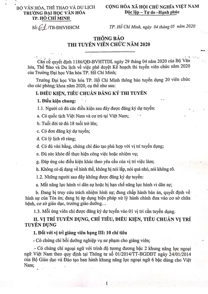 13.04.2026 Thông báo về việc mời các đơn vị quan tâm nộp hồ sơ đăng ký thực hiện gói thầu in ấn phôi bằng, chứng chỉ phục vụ cho công tác đào tạo và cấp phát văn bằng của Trường Đại học Văn hóa Thành phố Hồ Chí Minh