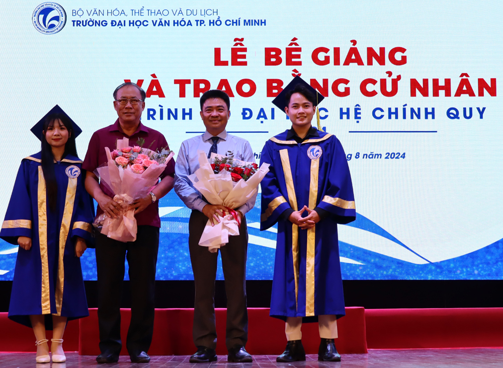 Tân Cử nhân Khoa Du lịch tặng hoa tri ân lãnh đạo Nhà trường (Thứ 2 và 3 từ trái sang: PGS.TS. Nguyễn Thế Dũng, Nguyên Hiệu trưởng và PGS.TS. Lâm Nhân, Hiệu trưởng Trường Đại học Văn hóa TP. Hồ Chí Minh).