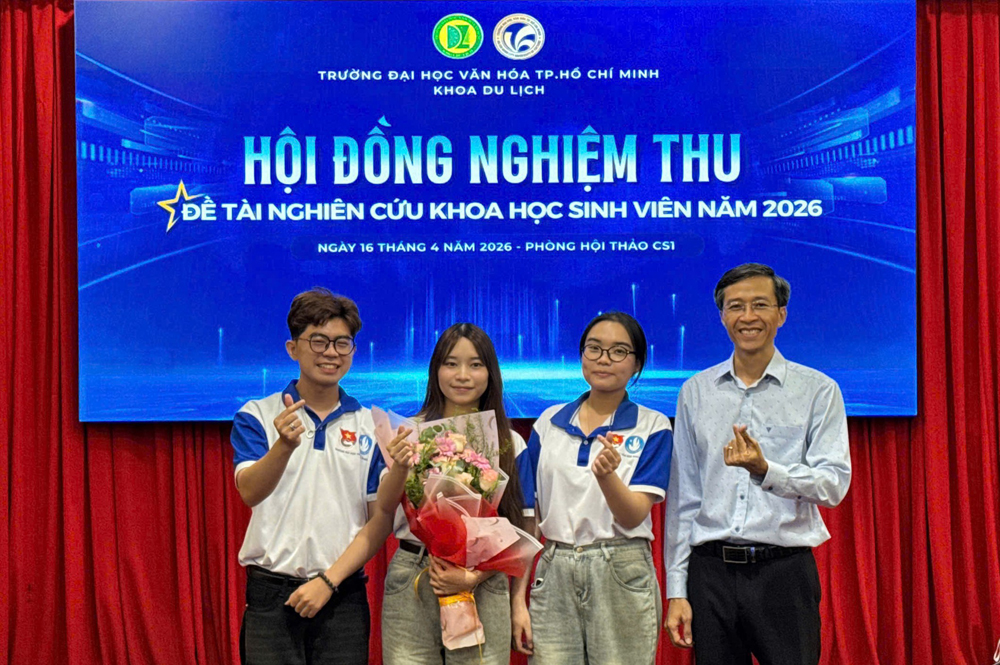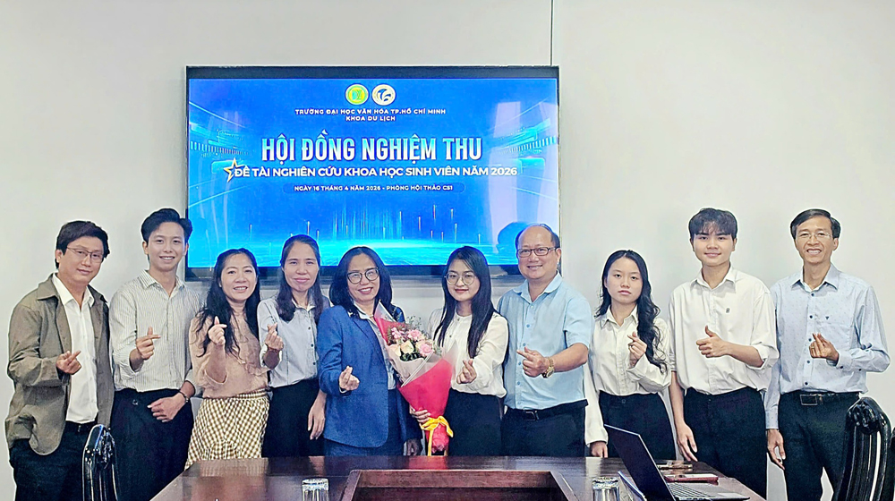 VHSO - Hoạt động nghiên cứu khoa học sinh viên tiếp tục ghi dấu ấn tại Trường Đại học Văn hóa TP. Hồ Chí Minh khi Khoa Du lịch vừa tổ chức nghiệm thu thành công các đề tài nghiên cứu khoa học sinh viên năm 2025 vào ngày 16/4 tại Cơ sở 1. Buổi nghiệm thu diễn ra trong không khí nghiêm túc, khoa học với sự tham gia của các hội đồng chuyên môn là những giảng viên, nhà nghiên cứu giàu kinh nghiệm trong lĩnh vực du lịch, quản trị lữ hành và văn hóa du lịch. Đây không chỉ là dịp đánh giá kết quả nghiên cứu mà còn là cơ hội để sinh viên thể hiện tư duy học thuật và khả năng vận dụng kiến thức vào thực tiễn.