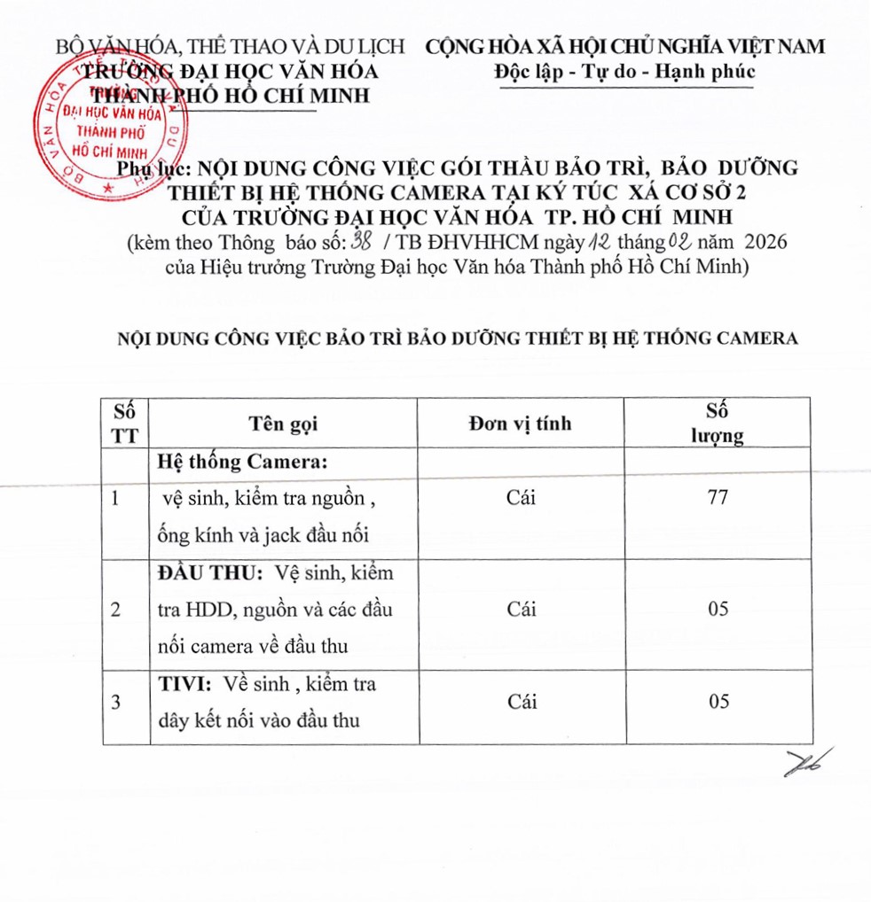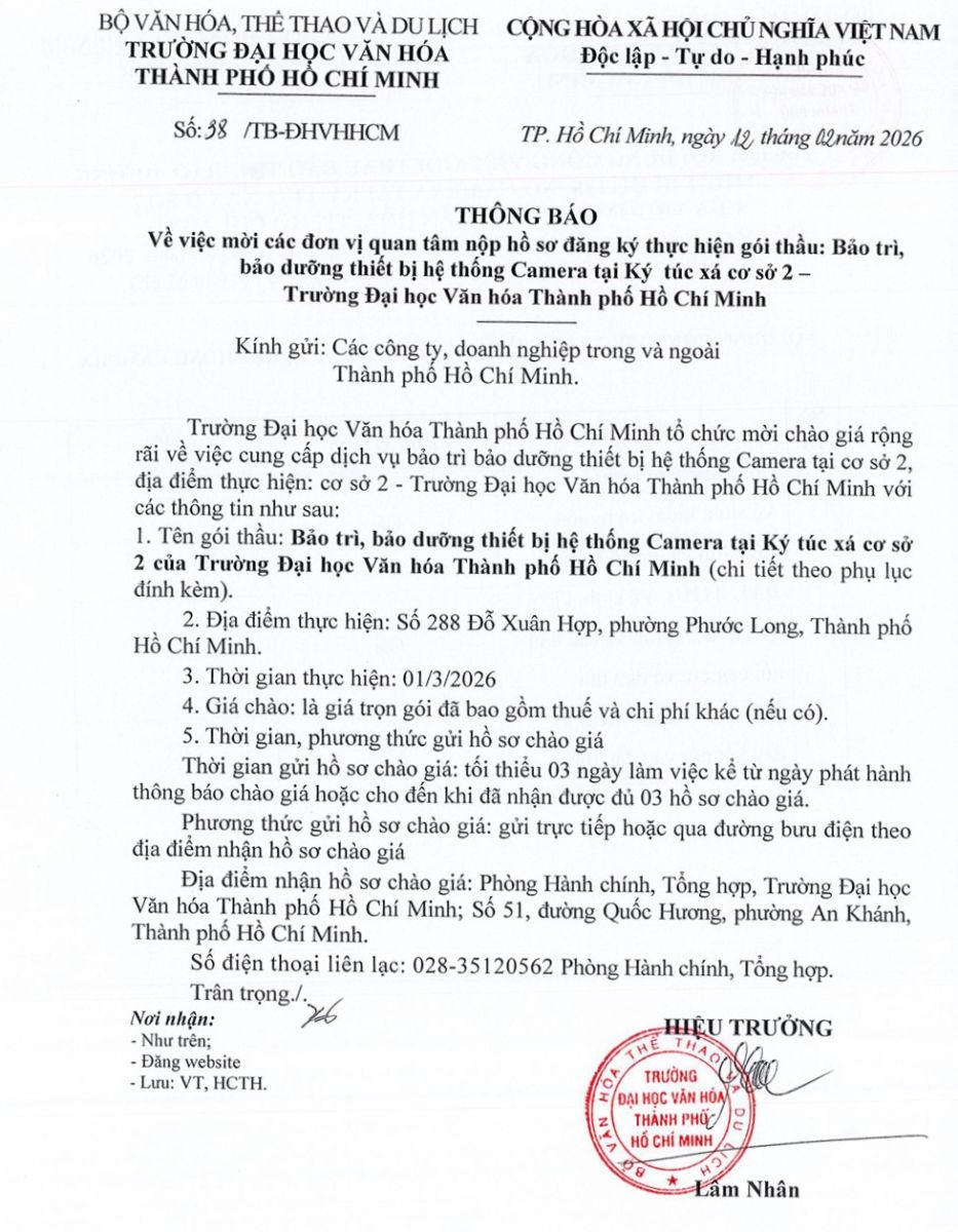 05.03.2026 Thông báo về việc mời các đơn vị quan tâm nộp hồ sơ đăng ký thực hiện gói thầu cung cấp bình chữa cháy cho Trường Đại học Văn hóa Thành phố Hồ Chí Minh