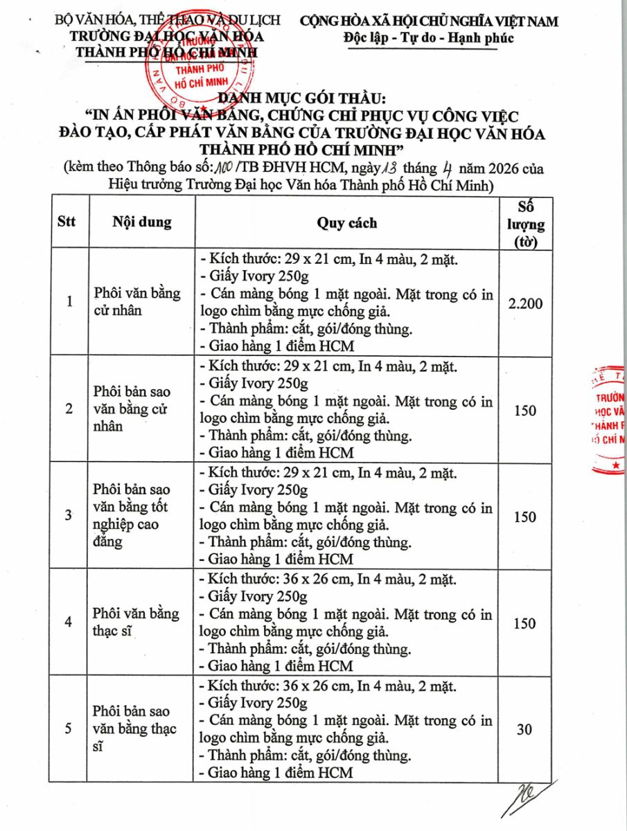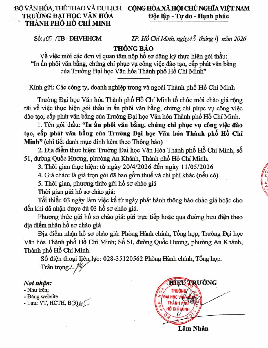 13.04.2026 Thông báo về việc mời các đơn vị quan tâm nộp hồ sơ đăng ký thực hiện gói thầu in ấn phôi bằng, chứng chỉ phục vụ cho công tác đào tạo và cấp phát văn bằng của Trường Đại học Văn hóa Thành phố Hồ Chí Minh