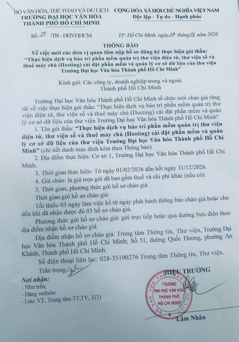 11.03.2026 Thông báo về việc mời các đơn vị quan tâm nộp hồ sơ đăng ký thực hiện gói thầu thiết kế lại website cho các đơn vị trực thuộc Trường Đại học Văn hóa Thành phố Hồ Chí Minh