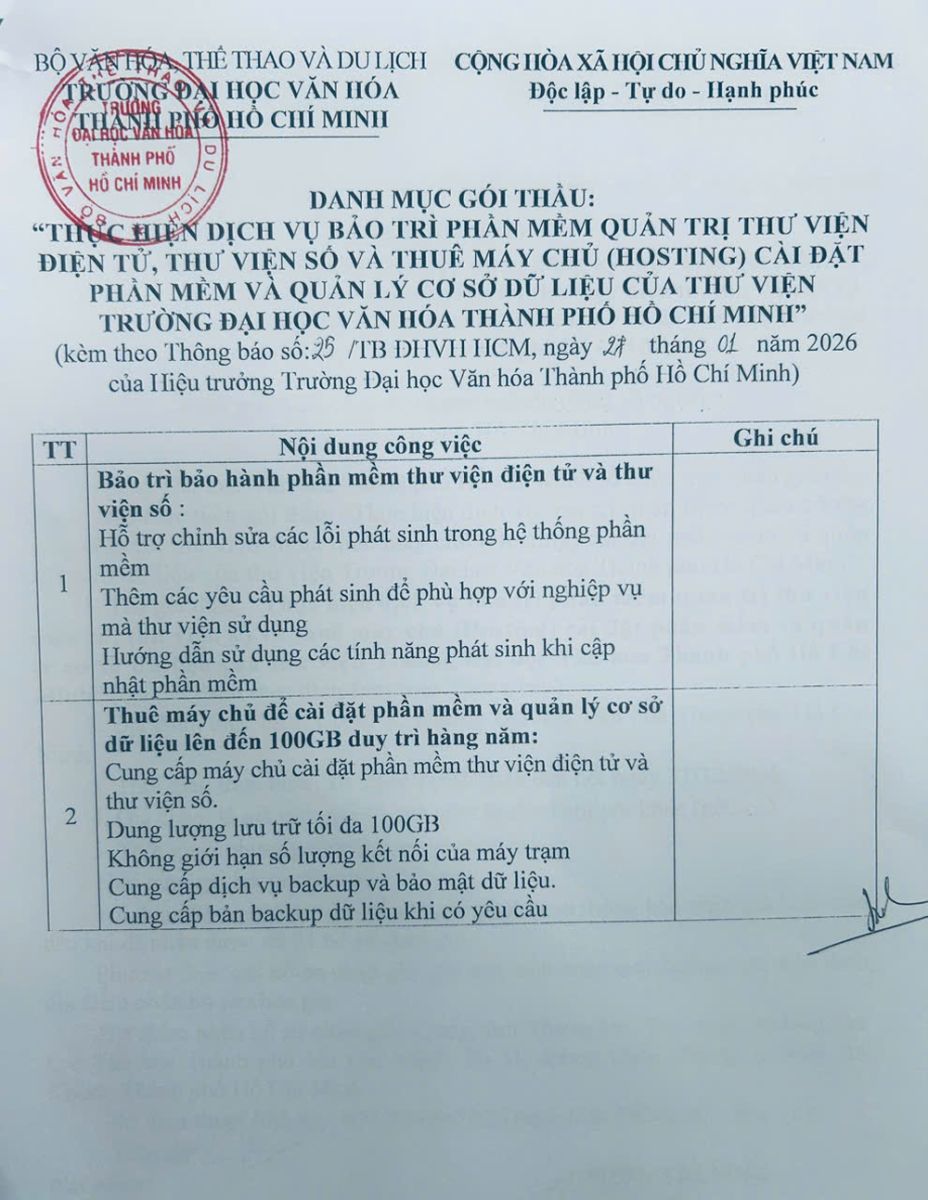 05.03.2026 Thông báo về việc mời các đơn vị quan tâm nộp hồ sơ đăng ký thực hiện gói thầu cung cấp bình chữa cháy cho Trường Đại học Văn hóa Thành phố Hồ Chí Minh