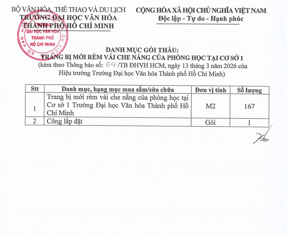 25.03.2026 Thông báo về việc mời các đơn vị quan tâm nộp hồ sơ đăng ký thực hiện gói thầu trang bị tủ gỗ đựng hồ sơ, bàn làm việc,... cho Trường Đại học Văn hóa Thành phố Hồ Chí Minh