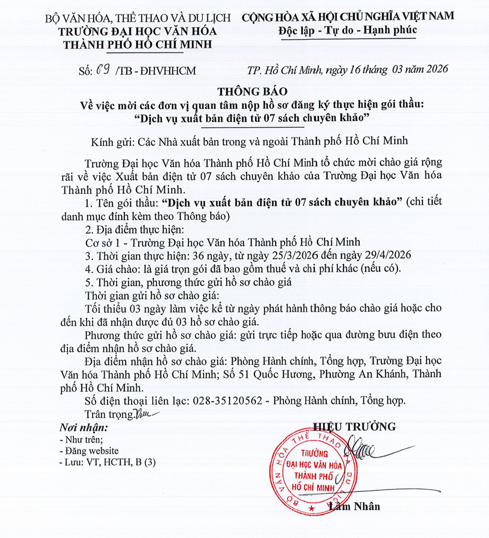 16.03.2026 Thông báo về việc mời các đơn vị quan tâm nộp hồ sơ đăng ký thực hiện gói thầu xuất bản điện tử 07 sách chuyên khảo cho Trường Đại học Văn hóa Thành phố Hồ Chí Minh