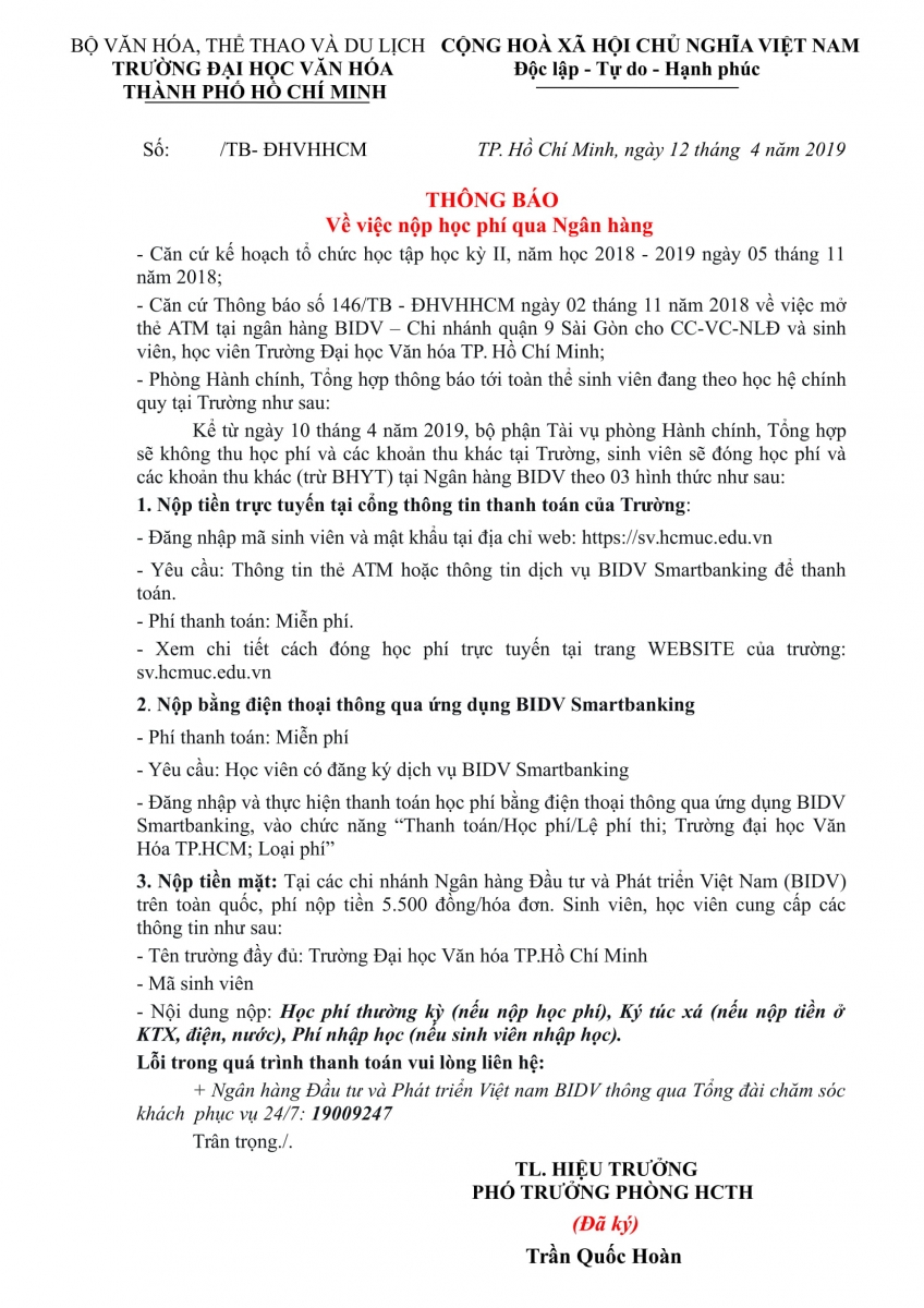 26.03.2026 Thông báo về việc mời các đơn vị quan tâm nộp hồ sơ đăng ký thực hiện gói thầu thực hiện dịch vụ bảo trì phần mềm quản trị Trường Đại học Văn hóa Thành phố Hồ Chí Minh